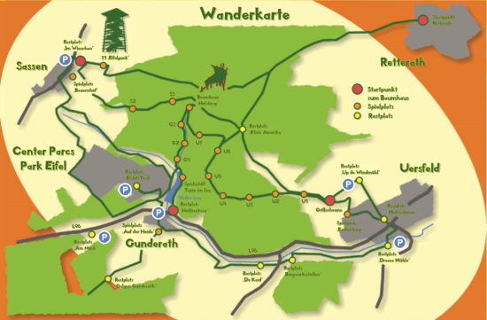 Vom Rastplatz "Heilbachsee", wo es per Geocaching den "Schatz vom Heilbachsee" zu entdecken gilt, geht es auf der