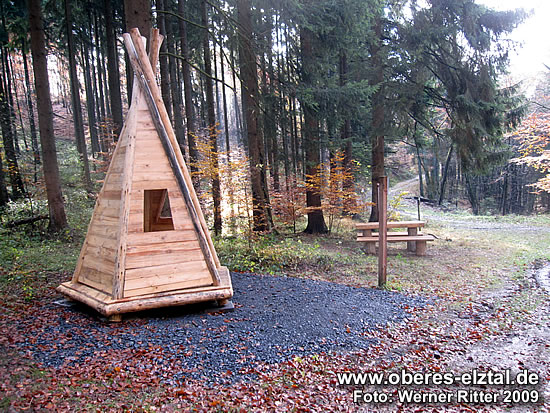 An dieser kleinen Lichtung am Holzberg, nahe dem Heilbachsee, wurde im Oktober 2009 ein Tipi, eine Sitzgruppe und eine Wandertafel aufgestellt.