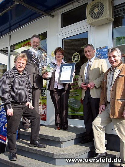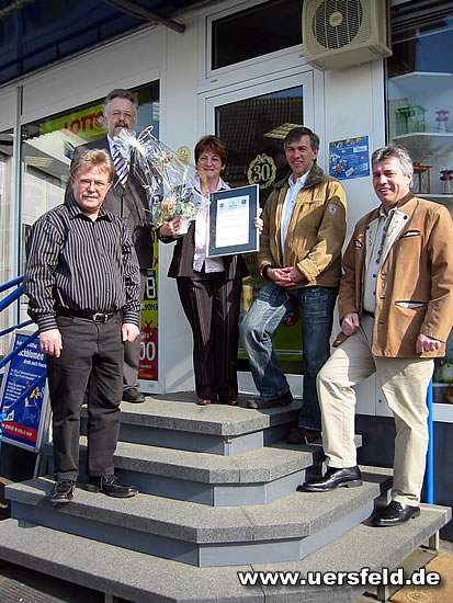 30 Jahre Schreibwaren Anita Lorenz in Uersfeld 01.04.2007 [von links: Hans-Ulrich Lorenz, Karl Häfner, Anita Lorenz, Werner Ritter, Andreas Daniels] Presseartikel zum Jubiläum